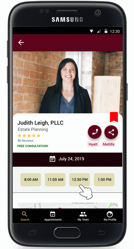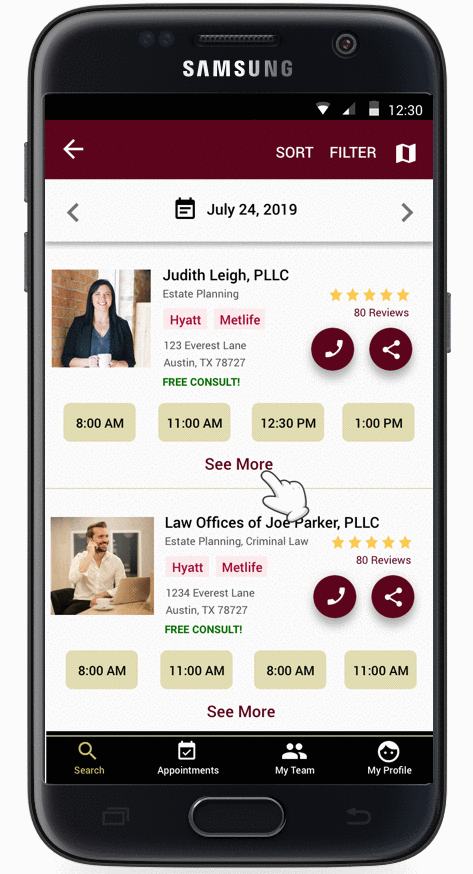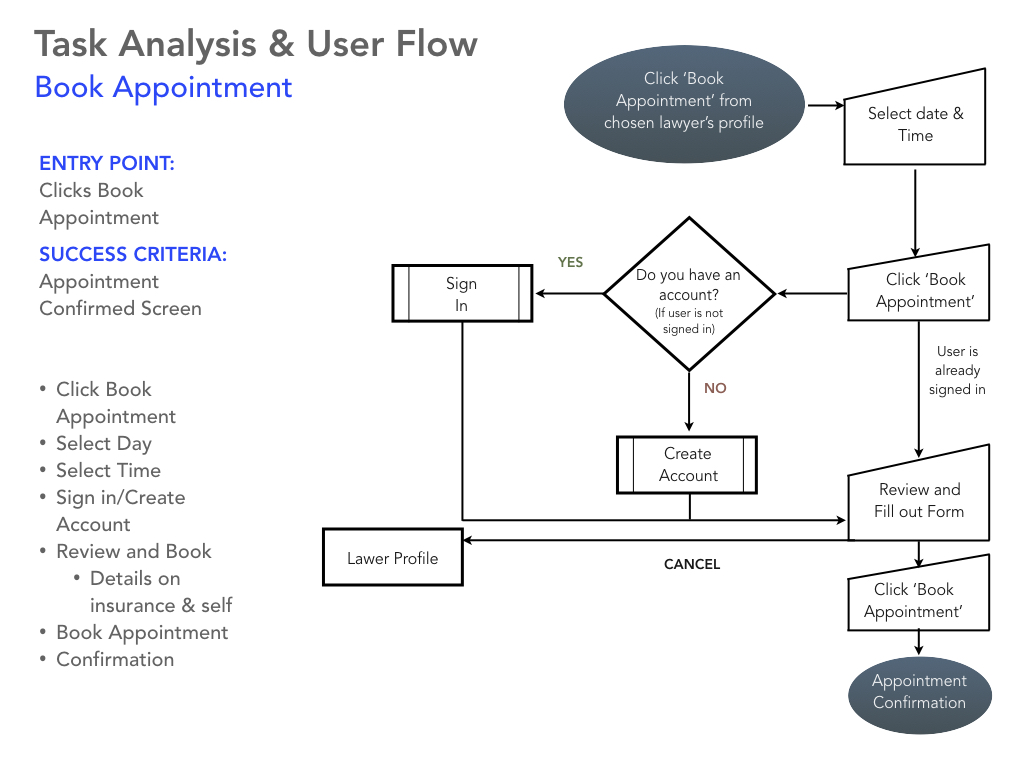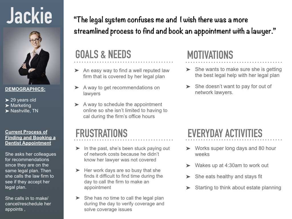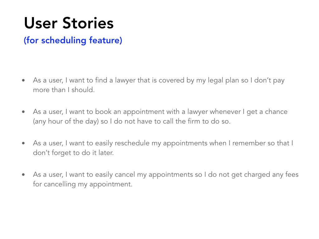 After conducting a competitive analysis and user research, I discovered that users need an all encompassing app where they can quickly find and book legal appointments (covered by their legal plan) because they don’t have the time to call in during the law firm's office hours. We will know this to be true when the number of appointments at various practices increase.
