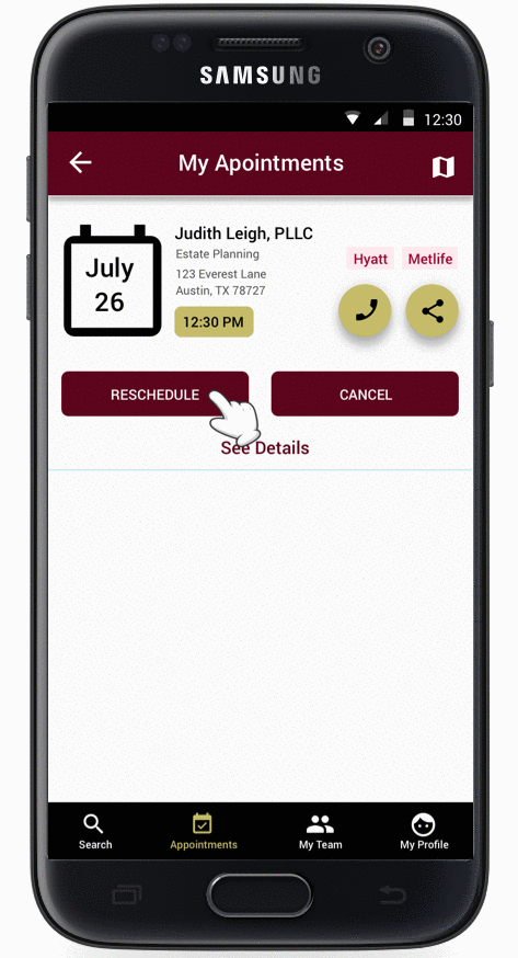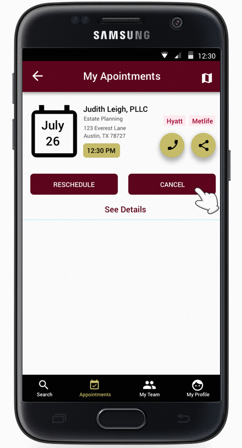 Participants thought the cancel button on the pop-ups were to escape out of the pop-up. They did not realize that the cancel would start the cancel appointment process. However, when the cancel button on the "my appointments" screen led to no confusion. So in the next iteration, I propose adding the word appointment to the button in the pop-ups or changing the question so it is more evident. Also, participants brought up the valid issue of "what if I want to reschedule an appointment with a different lawyer within the same practice?". They mentioned that it would be tedious to cancel the appointment and then go search again for the specific lawyer in the same firm to book an appointment. This is also something that will be addressed in the next iteration.