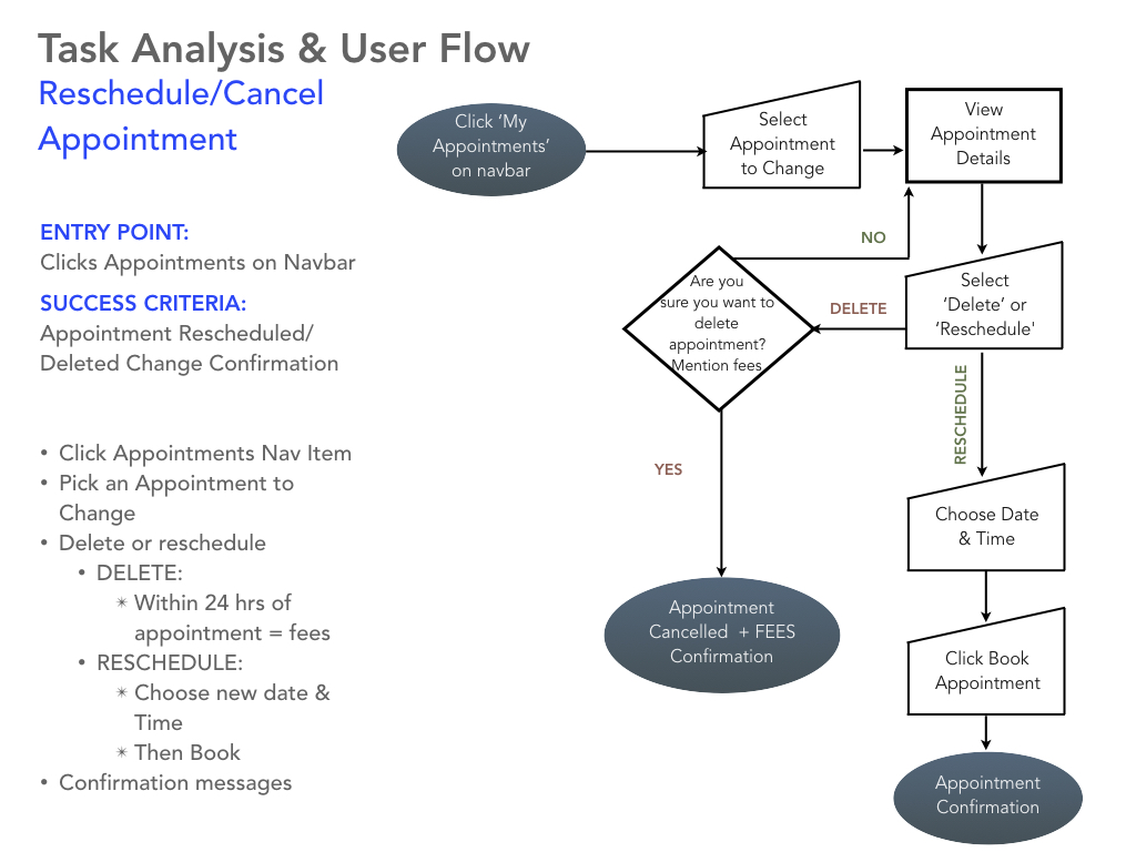 Usability Testing:Due to this project's nature and the rapid turn around time, I was unable to perform formal usability testing. Instead, I ran informal usability tests with 3 of my friends who fit the demographic, and I got some valuable feedback. Tasks included booking, rescheduling, and canceling an appointment. One of the critical issues testing uncovered was that 2 out of the 3 participants found the cancel button confusing.