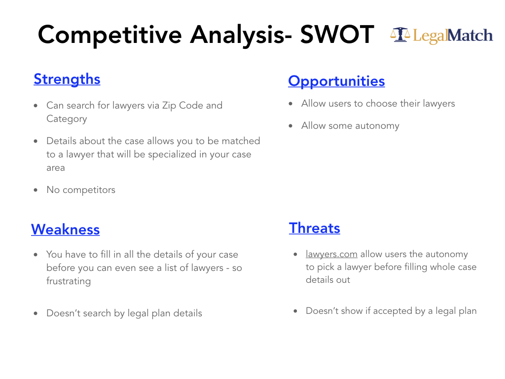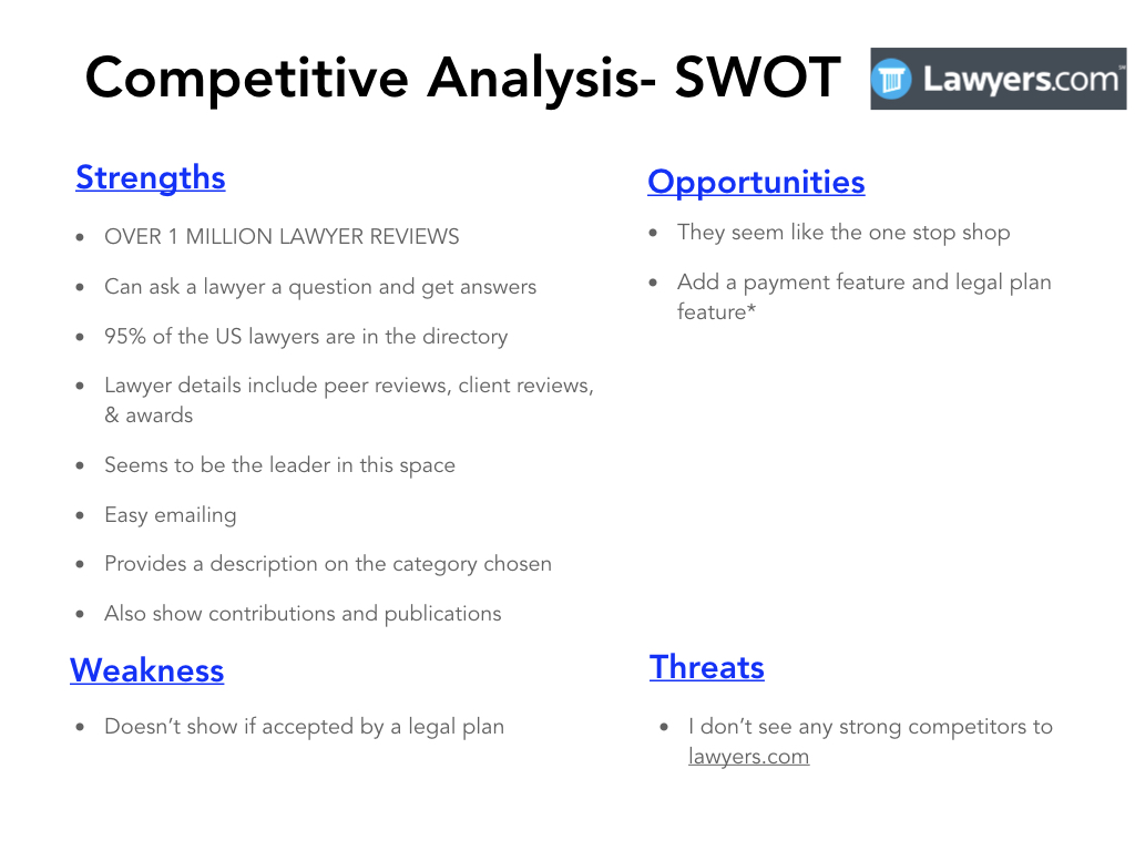 In the experience strategy portion, my main focus was on comprehensively understanding the problem. Researching what my competitors were doing well and what they were doing poorly, allowed me to get insight into gaps in the industry. I enjoyed using the SWOT method with my competitive analysis because it allowed me to organize my findings and find opportunities to set Legal Now apart from its competitors.