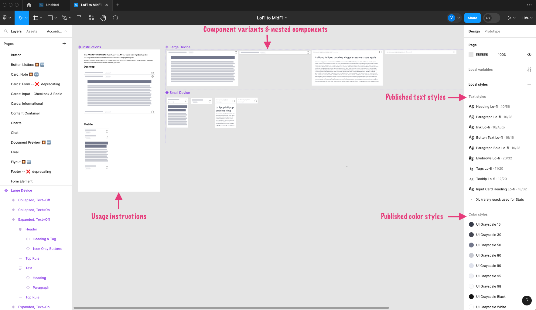 I also looked at existing LoFi UI Kits like (Balsamiq, Miro, and Figma Community) to see if there was an existing tool that could be leveraged. While I was initially tasked to create a LoFi UI Kit, it quickly became clear from my discussions that what the product design team needed was a tool kit that allowed for desiging in LoFi & MidFi. Because of the speed at which designers had to pump out designs for development, allowing designers to be able to switch a component quickly from Lofi to MidFi became pretty important.