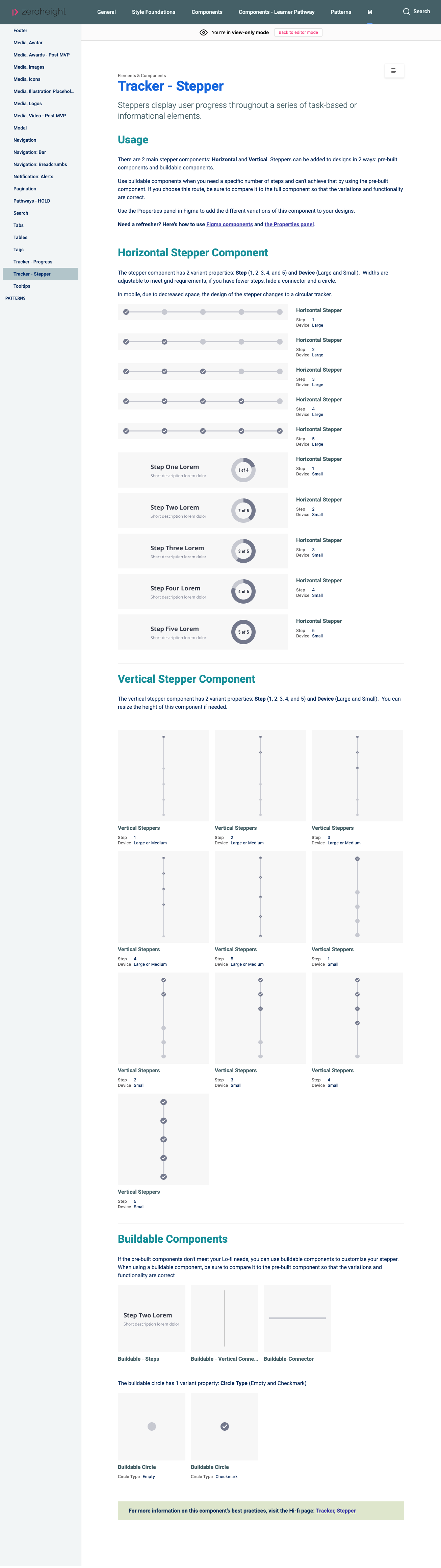 After successfully passing the testing process in Figma, the component was prepared for documentation in Zeroheight. The kit's documentation comprised of a getting started page, release notes, a foundations section (covering grid, color palette, typography usage, and device mockups), and a dedicated page for each component. Once documented, the component was published in Figma for others to access and utilize. These component pages detailed all variants and provided usage instructions. Subsequently, an announcement was shared in our Microsoft Teams channel to inform designers that a component was ready for use.